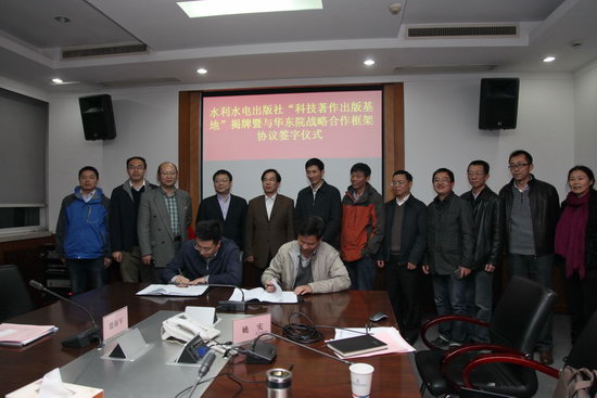 華東院人力資源部主任張建樹、水電事業部主任徐建軍、科技信息部副主任姚實、勘測處副處長陸飛、華東海上風電研究中心總工李煒、科技信息部主管程平以及我社水利水電出版分社社長黃會明、電力能源出版分社能源編輯室主任殷海軍、數字出版中心主任助理彭天赦、水利水電出版分社編審王照瑜、編輯劉巍共同見證了科技著作出版基地成立暨戰略合作框架協議簽訂的儀式。